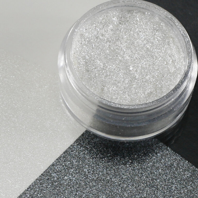 Diamond Sparkle White is built on a Calcium Aluminum Borosilicate substrate—a type of synthetic glass. Unlike natural mica, these engineered platelets are exceptionally smooth, thick, and transparent. This structure enables maximum light reflection for a cleaner, brighter, and more intense sparkle. The large particle size (50–200 μm) ensures each platelet catches the light to deliver a true diamond-like glisten.