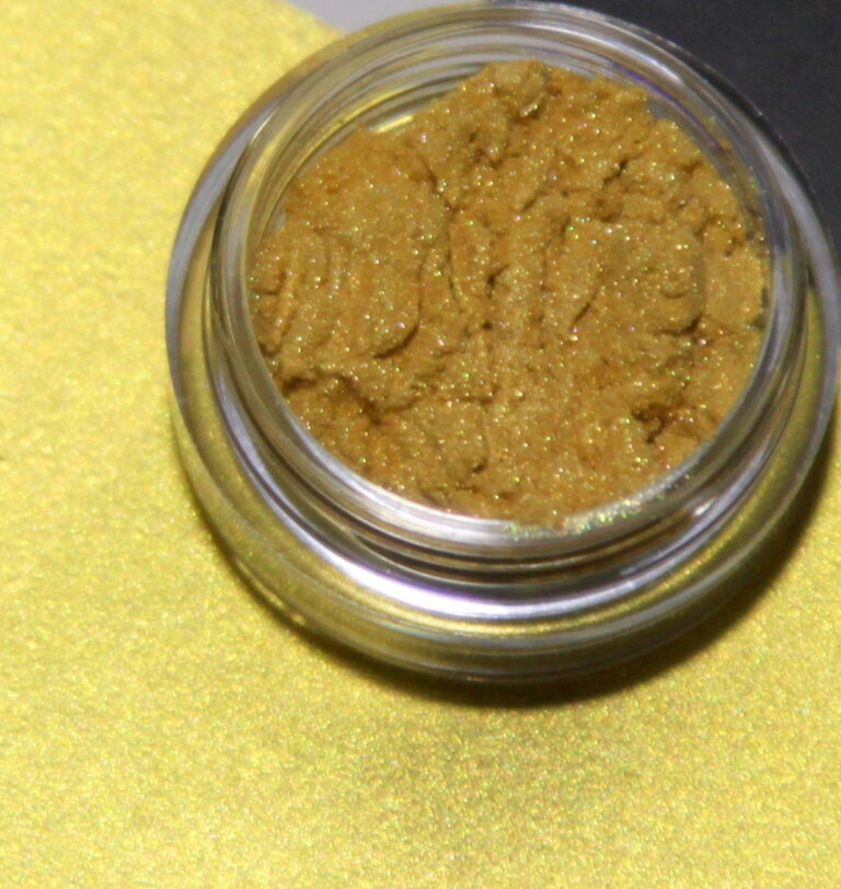 The result is a clean, high-chroma light gold with a refined satin finish—delivering luminous payoff without the overt sparkle seen in larger particle pearls or glitters.