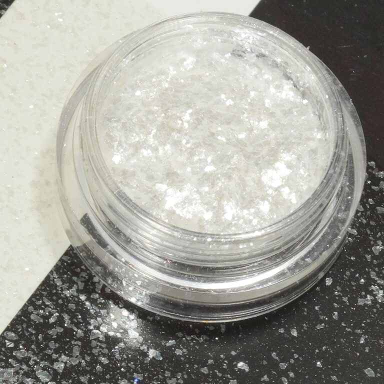 Sachet Splendid White utilizes large, transparent synthetic fluorphlogopite platelets coated with Titanium Dioxide to generate its intensely brilliant, chunky sparkle. The exceptionally large particle size (200–1000 μm) maximizes light reflection, creating a dazzling effect similar to glitter without the use of microplastics. The synthetic mica base ensures superior purity and brightness compared to natural mica, resulting in a clean, high-chroma white sparkle.