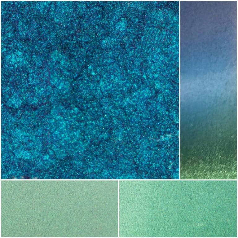 SilikMira Variable TBV utilizes a silica substrate (10–60 μm) coated with titanium dioxide, iron oxides, synthetic fluorphlogopite, and ferric ferrocyanide to produce a cool-toned color travel shifting between teal, blue, and violet. The fine particle size ensures a refined, sophisticated color play.