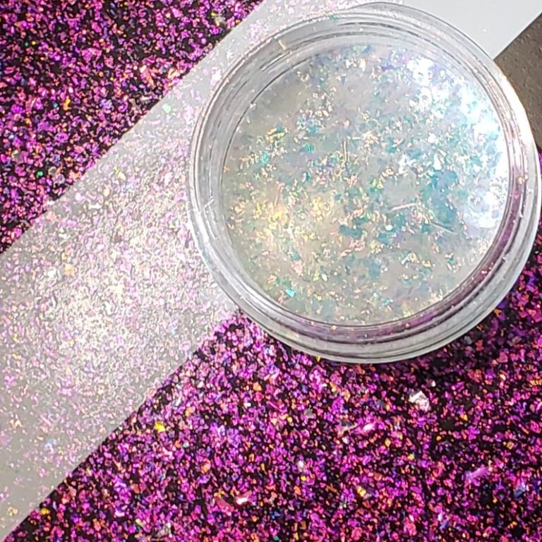 “Crushable” describes the flakes’ ability to gently break down during application or pressing, enabling controlled laydown and customizable texture—from bold, chunky sparkle to a smoother, multi-faceted shimmer.