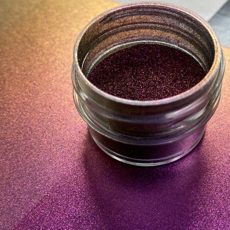 SilikMira Xtreme PVOG achieves its revolutionary four-way color travel through a highly advanced multi-layer coating process. An ultra-thin layer of silica is precisely deposited onto a metallic substrate of aluminum powder and synthetic fluorphlogopite. This structure is engineered to refract light at multiple, distinct angles, creating the dramatic shift from purple to violet, orange, and finally green. The metallic aluminum base provides exceptional opacity and a true metallic luster that elevates the effect beyond standard color-travel pearls.