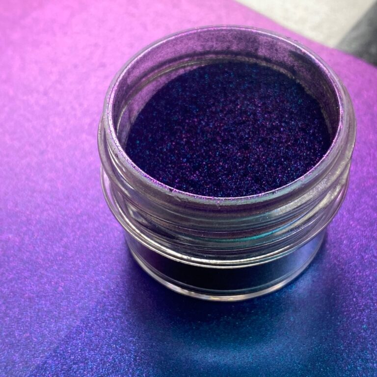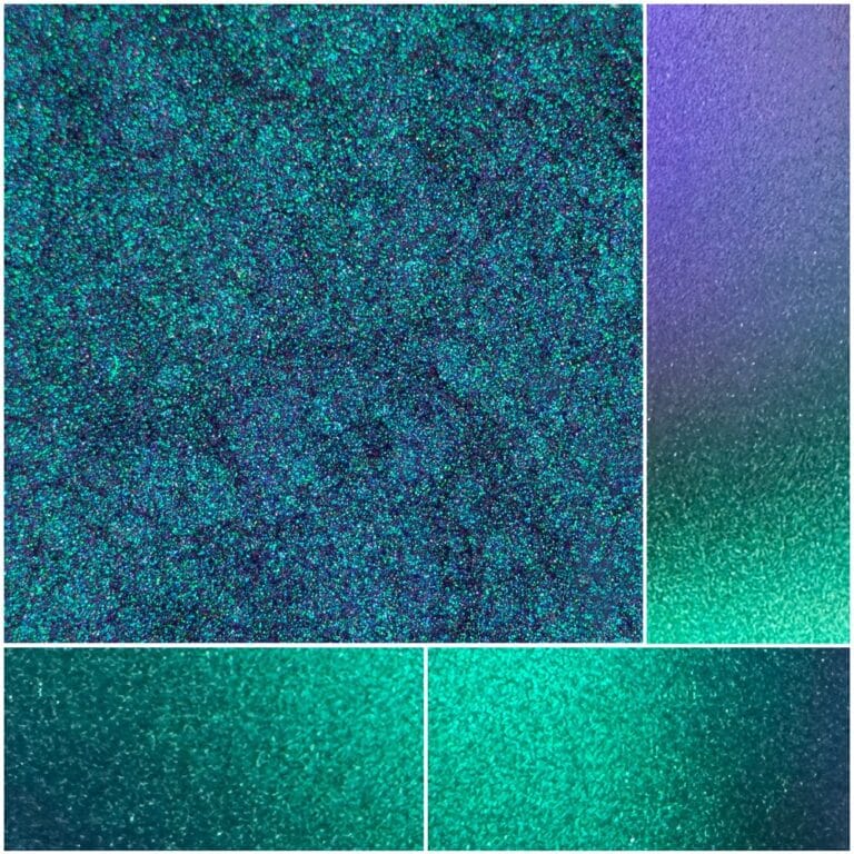 SilikMira Xtreme TGPR achieves its revolutionary four-way color travel from Turquoise–Green–Purple–Red through an advanced multi-layer coating process on a specialized substrate. Unlike traditional color-shifting pearls, this pigment utilizes a composite base of silica and aluminum powder. The aluminum provides a highly reflective, metallic base that dramatically amplifies the chromaticity and saturation of the color shifts, resulting in an effect that is brighter and more intense than conventional mica-based pigments.