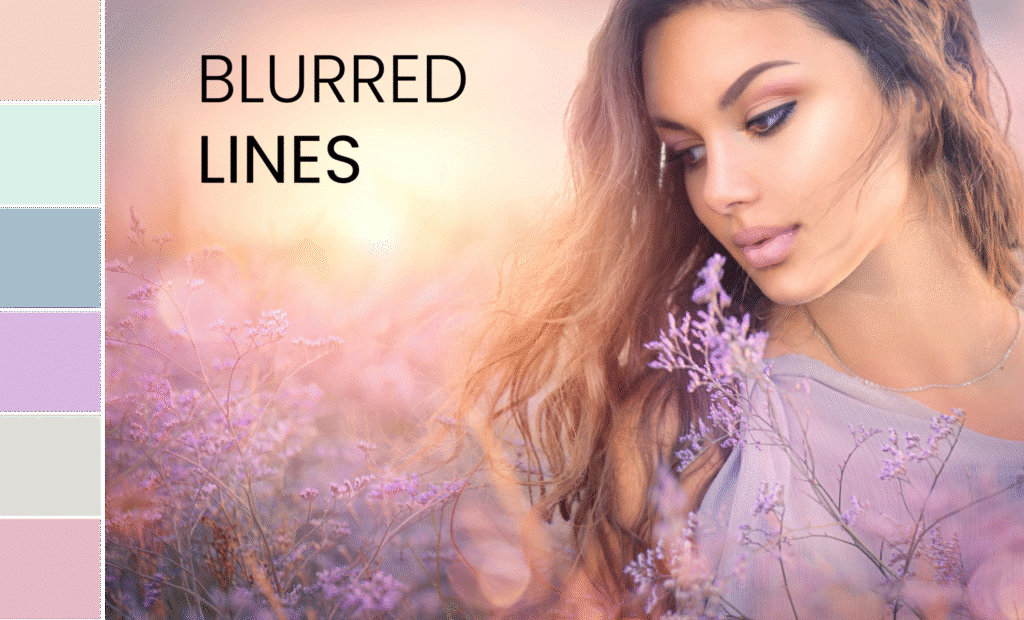 This tranquil and feminine color palette whisks you away on a dreamy escape from the real world. Translucent or subtly tinted finishes that exude glistening radiance capture the eyes. Pigment fluidity is exhibited in soft interference color travel, enhanced in liquid and cream mediums. Formulations skew towards dual or multipurpose, eliminating defined boundaries and yielding “blurred lines.”